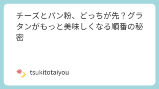 料理 チーズとパン粉、どっちが先?グラタンがもっと美味しくなる順番の秘密 グラタンを作るとき、「パン粉とチーズってどっちを上にのせればいいの?」と迷ったことはありませんか?実はこの順番は単なる見た目の問題ではなく、食感や味わいに大きな違いをもたらします。カリッと香ばしく仕上げたいのか、とろ~り濃厚なチーズ感を楽し... 料理