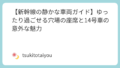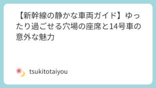 豆知識 【新幹線の静かな車両ガイド】ゆったり過ごせる穴場の座席と14号車の意外な魅力 新幹線に乗るたび、「もう少し静かな車内で過ごせたら…」と感じたことはありませんか?長時間の移動では、車内アナウンスや会話の声、キャリーケースを動かす音など、意外と小さな雑音が気になってしまうもの。そんなときに“静かに落ち着ける空間”があると... 豆知識