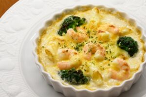 チーズは焼くことでとろけ、ホワイトソースや具材をやさしく包み込みます。濃厚でクリーミーな味わいが楽しめ、グラタン全体にコクとまとまりを与えてくれる大切な存在です。