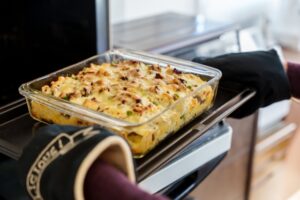 焼き色が早くついたらアルミホイルをかぶせ、中心まで火を通す工夫をしましょう。さらに、大きめのグラタン皿を使う場合は中心が生焼けになりやすいので、最初は中温でじっくり火を通し、最後に高温で表面を焼き上げるとバランスよく仕上がります。